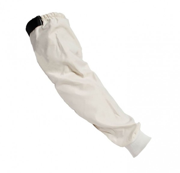Mangote de segurança, confeccionada em sarja mista de poliéster e algodão, elástico e velcro para ajuste superior, punho em malha, comprimento total de 50 cm.